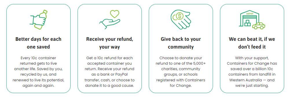 Through Containers for Change, Western Australians can return empty eligible containers for a 10-cent refund, which can either be kept for themselves or donated to a registered charity, community group or not-for-profit.